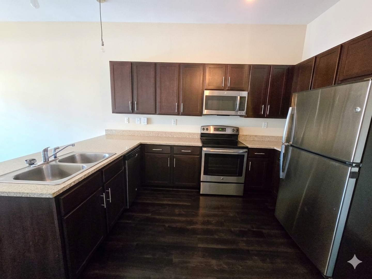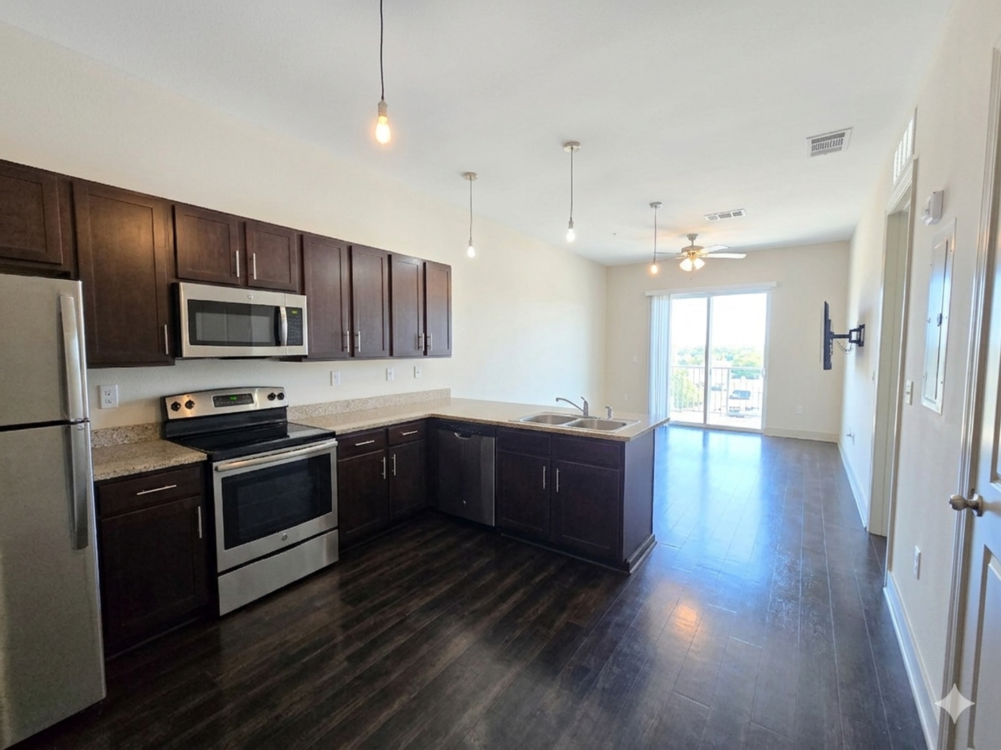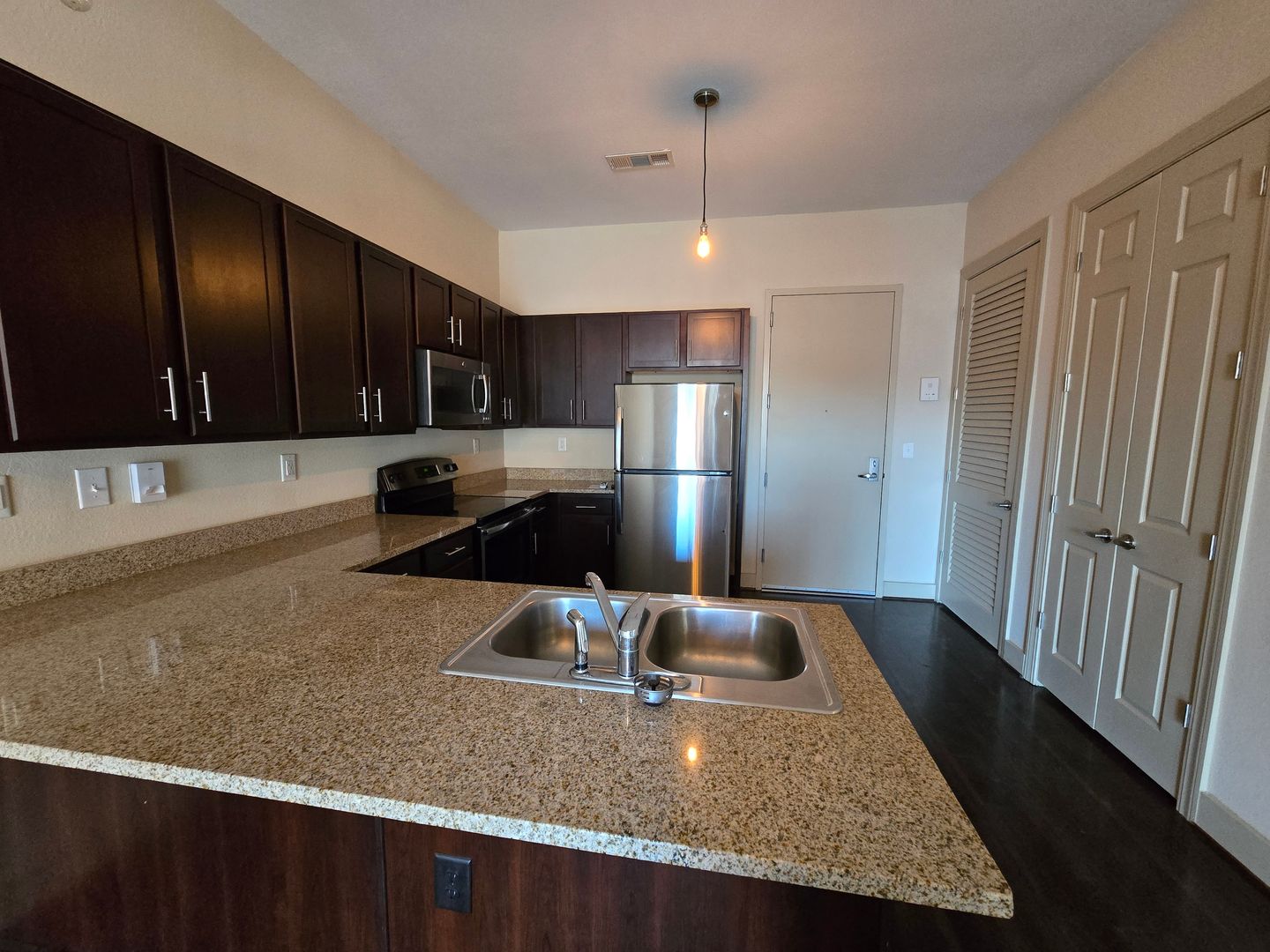 Gourmet Kitchen: Featuring sleek granite countertops, a pantry for extra storage, and a full set of stainless steel appliances including an electric range, microwave, and refrigerator.